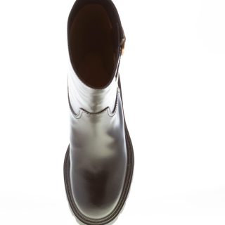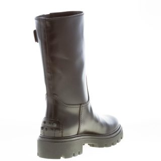 Black semi-shiny leather Biker boots with a round toe and a gold-tone buckle at side. Rubber gommini detailing on the heel. Slip-on style dress. Lugged rubber outsole. Rubber heel 3 cm