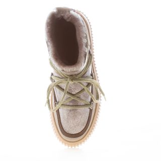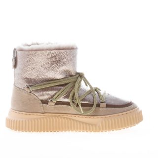 Stivaletto Cortina realizzato in pelle laminata e nabuk nei toni del taupè e fango con fodera di montone. Inserto glamour con lacci in stile doposci. Suola in gomma ultra-leggera con profilo zigrinato