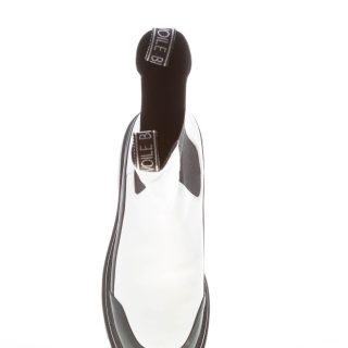 White leather elasticized bootie with side black ease dress elasticized bands. Black contrasting rubber details. Rubber sole