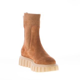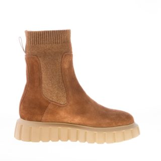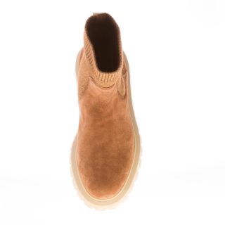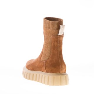 Stivaletto elasticizzato Bethel realizzato in camoscio marrone con inserto a calzino in maglia elasticizzata tono su tono e pull-up brandizzato. Suola in gomma leggera rialzata con dettaglio scanalature