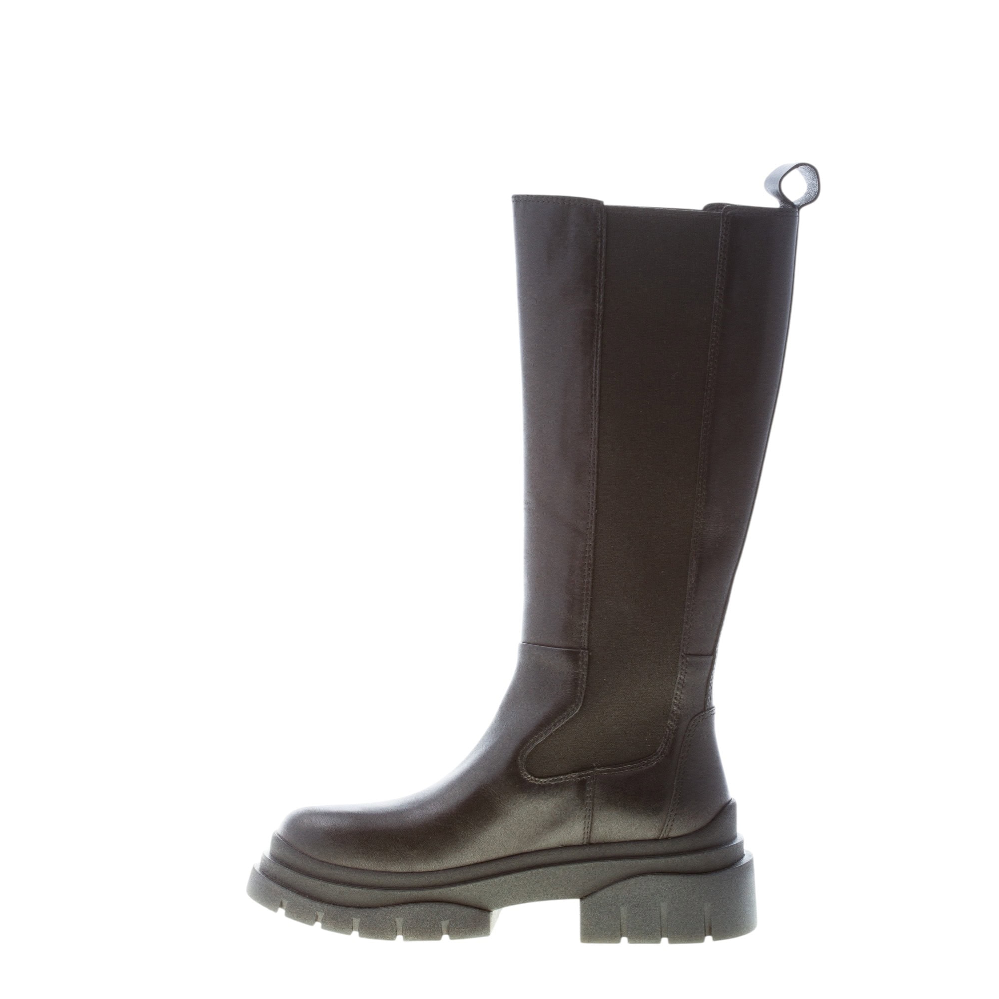 Stivale elasticizzato Stone realizzato in pelle nera con punta tonda e fasce elasticizzate ai lati per agevolare la calzata. Pull tab. Maxi suola in gomma. Tacco 5 cm.