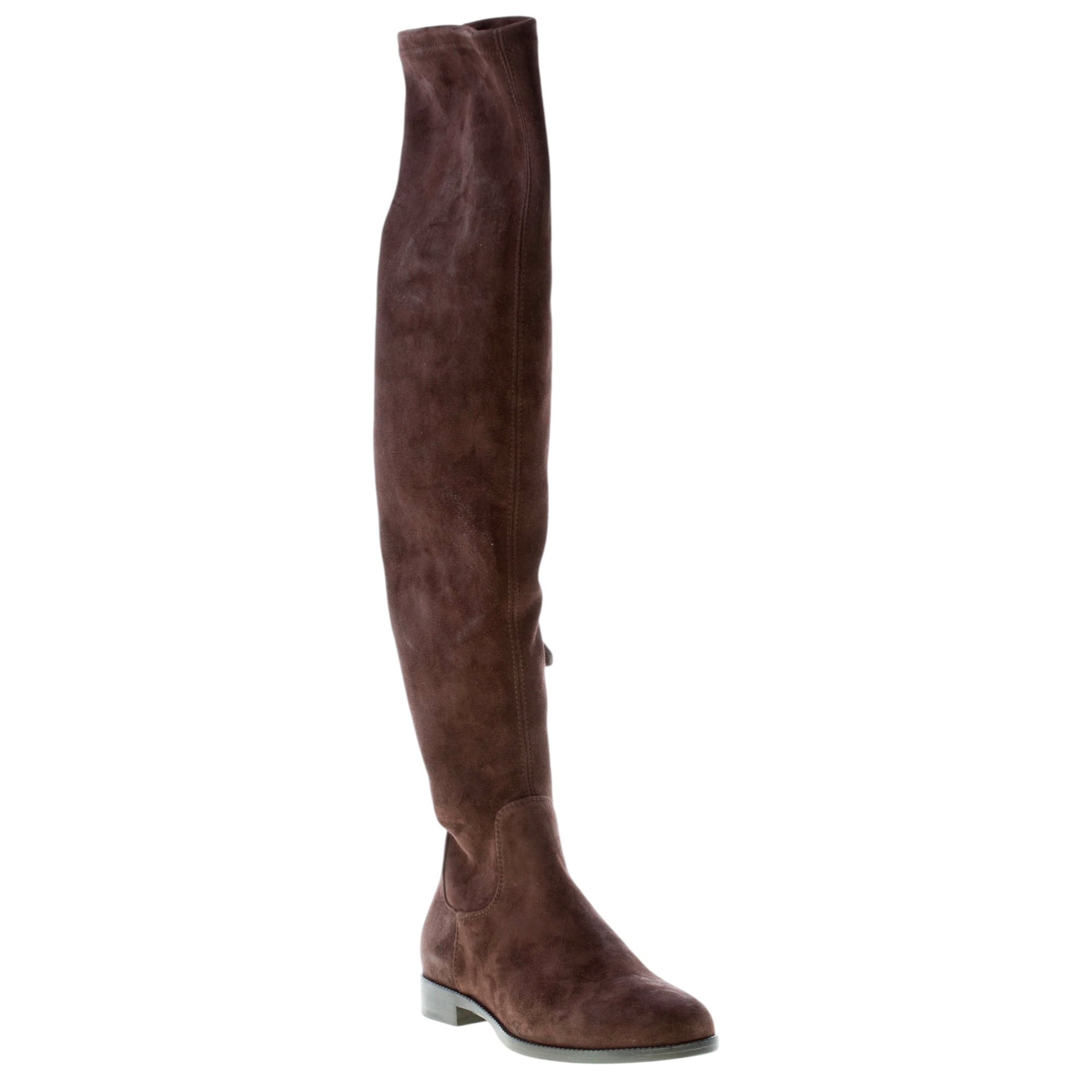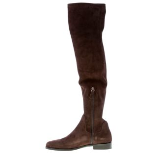 Brown chocolate stretch suede Minnesota over-the-knee boot with a round toe and a side ease dress half leg zip fastening. Exposed stitchings on the vamp. Heel 2 cm. Leather sole with rubber anti-slippering insert
