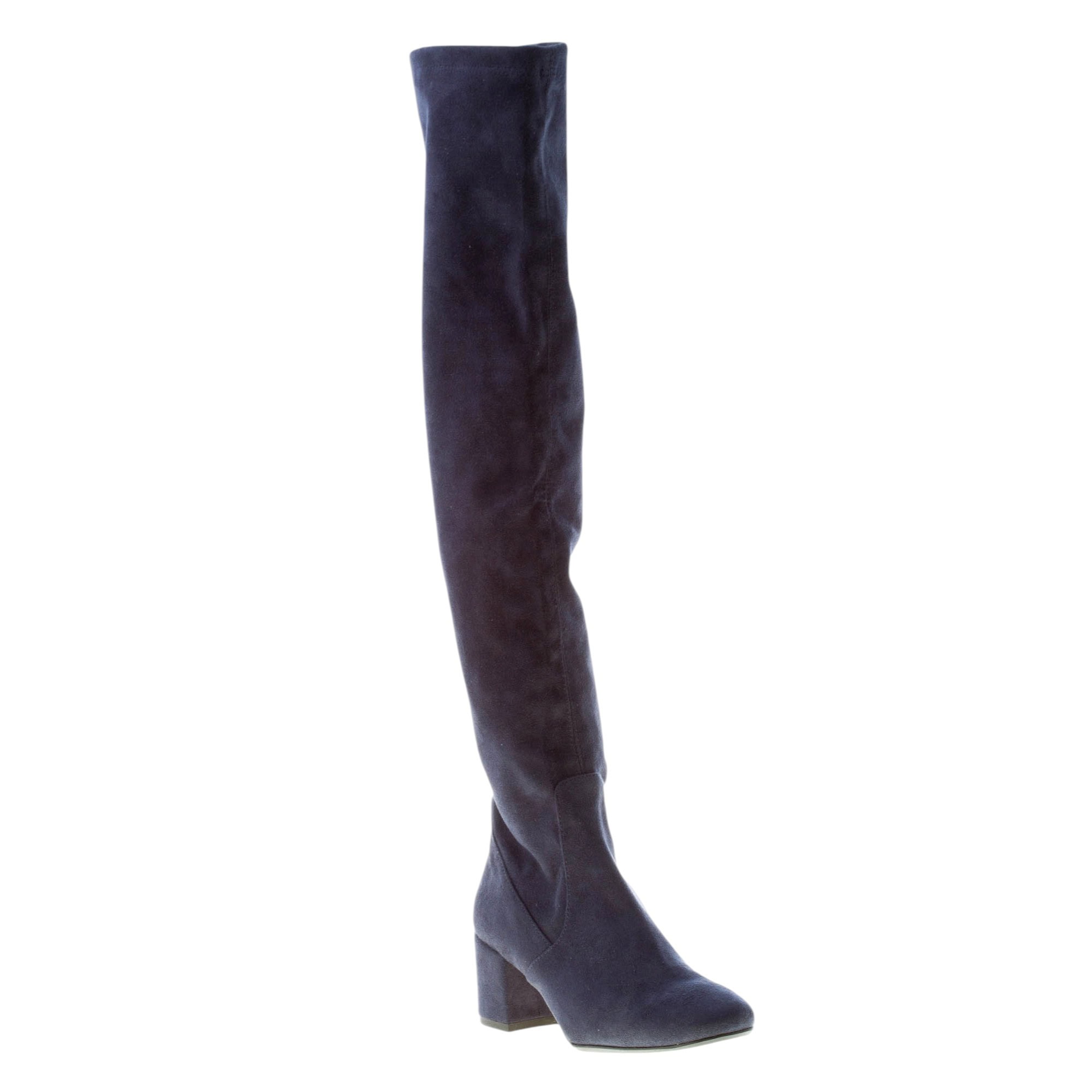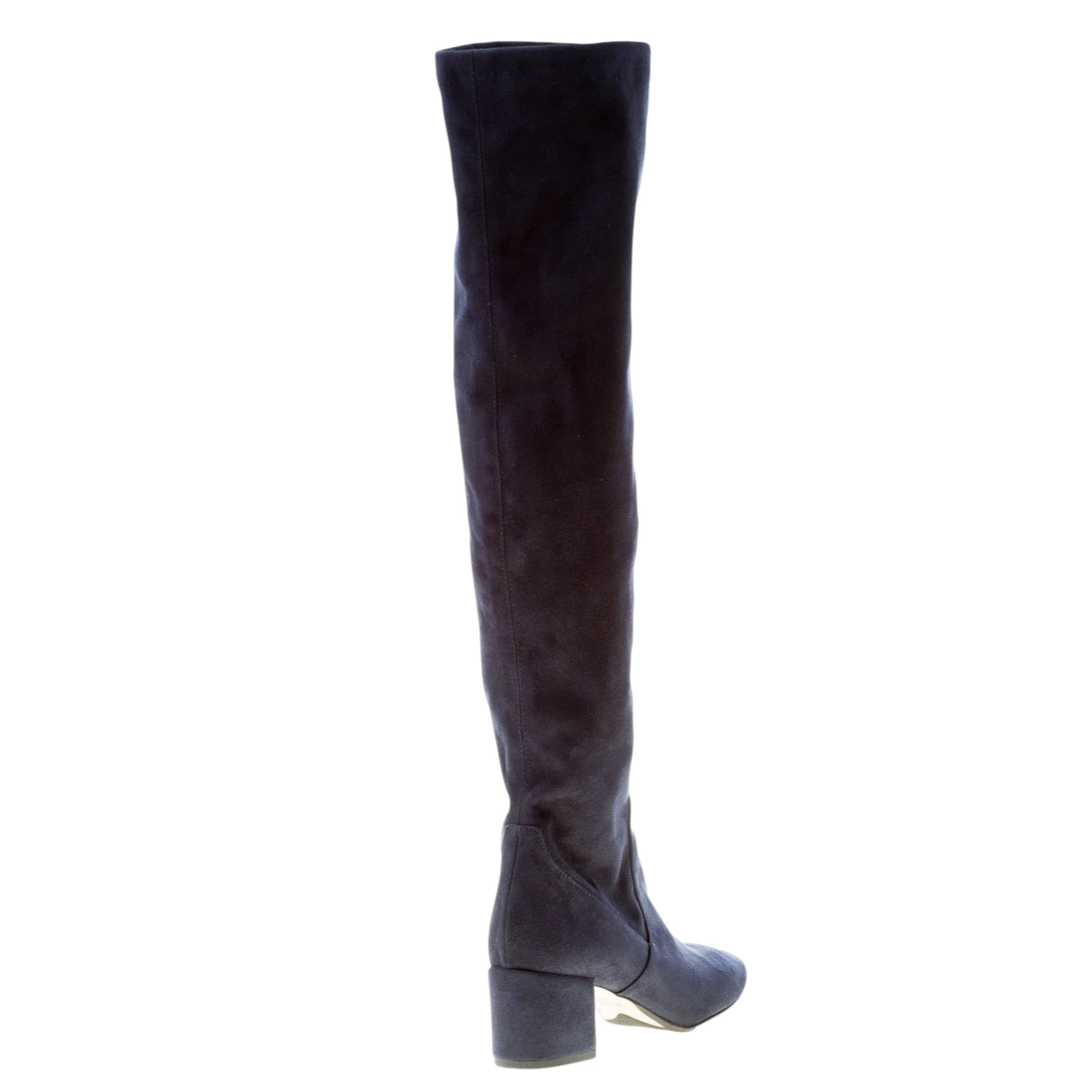 Stivale sopra al ginoscchio realizzato in camoscio elasticizzato blu. Punta tonda. Suola in cuoio con inserto anti-scivolo in gomma. Tacco 5 cm