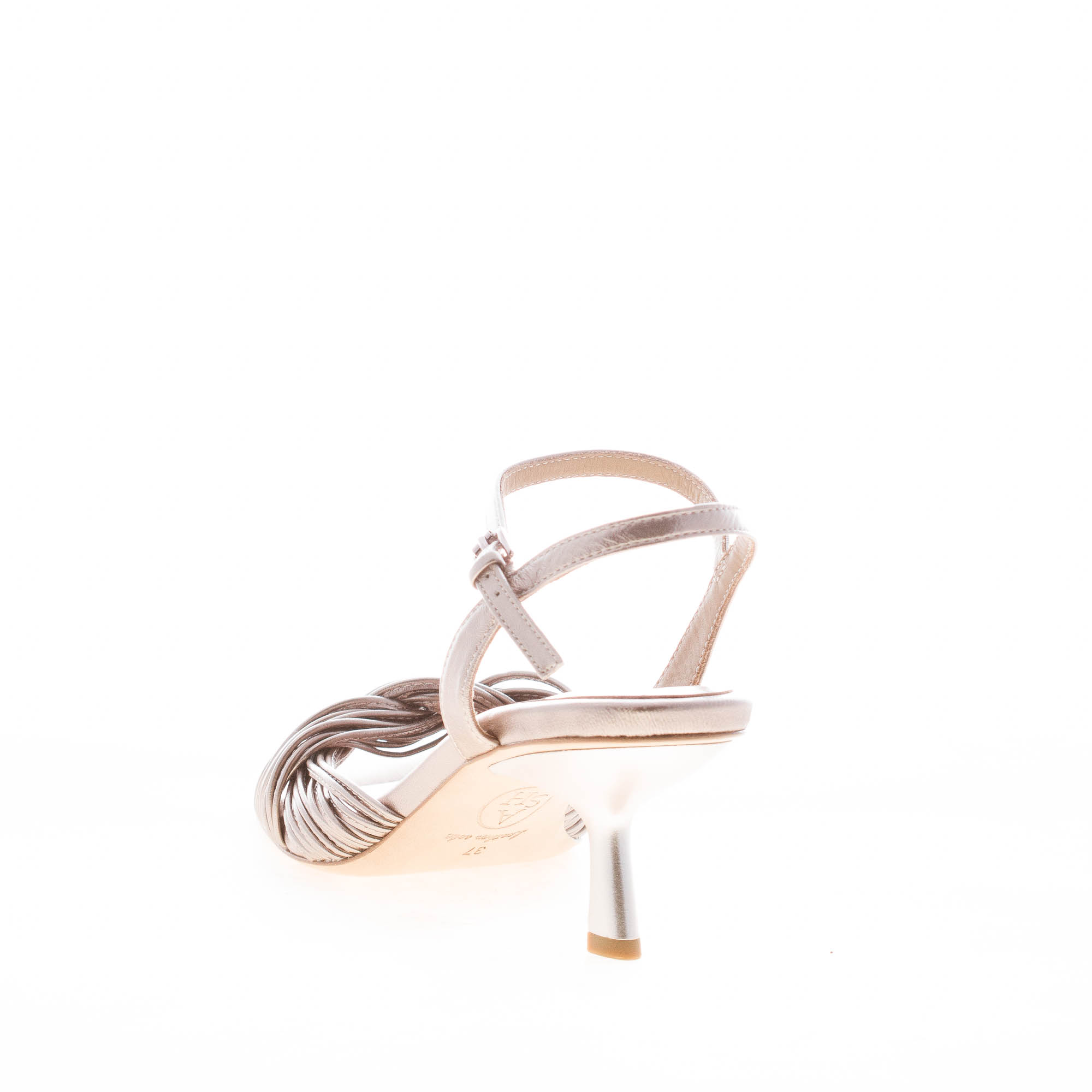 Champagne tone leather Janis heel sandal with two knotted bands made with multiple thin straps. Ankle strap closure with adjustable golden metal buckle. Heel 5,5 cm. Leather sole
