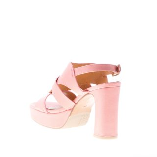 Sandalo in pelle rosa con fascia frontale accollata e leggermente elasticizzata. Plateau di 3 cm. Tacco di 10 cm. Suola mista cuoio e gomma