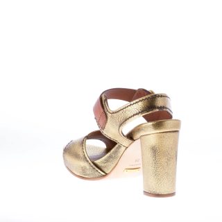 Antiqued gold leather sandal with golden and natural leather buckled ankle strap. Leather sole. Heel 10 cm. Golden midsole with 2 cm plateau