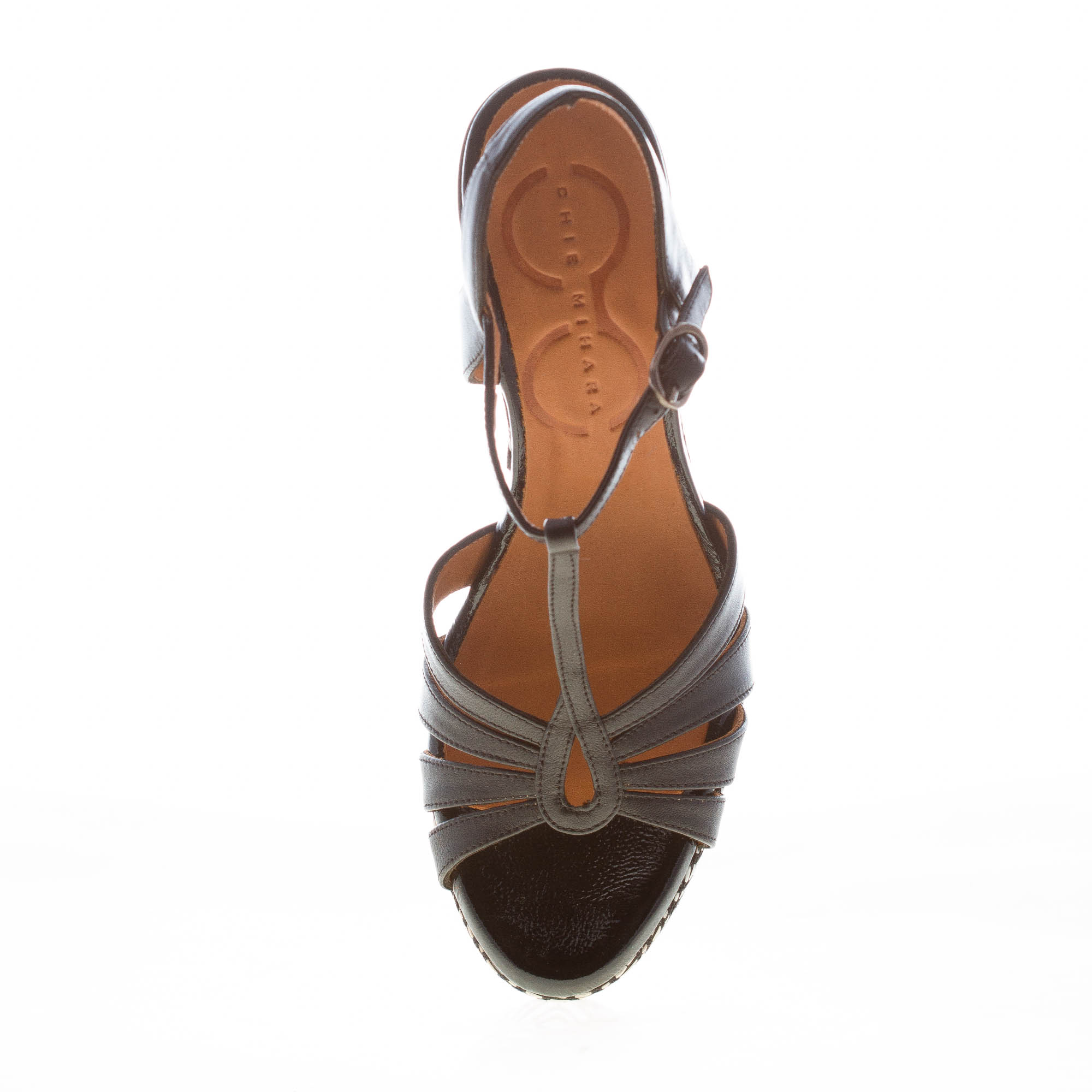 Junni black leather sandal with a front T-Strap silhouette and multiple thin straps at toe. Ankle strap closure with an adjustable metal buckle. Maxi 4 cm height platform covered with a fabric with a geometric pattern printing. Leather sole with rubber antislippering insert. Patent leather covered heel 11 cm