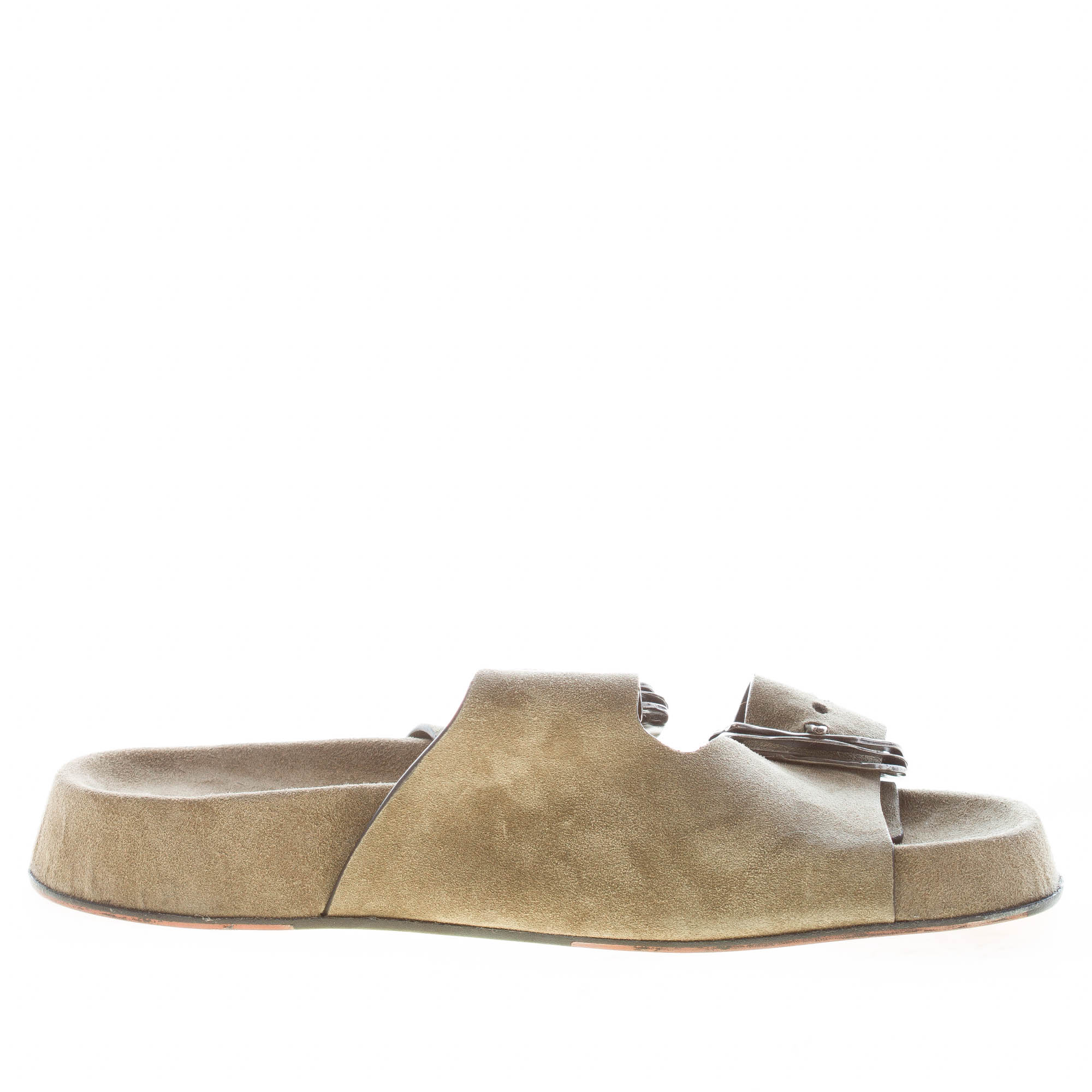 Sage green suede Kazar 02 flatform slide sandal, made in Italy, with double strap and silver metal maxi buckles. Slip on dress. Covered platform. Height approximately 2,5 cm. Leather sole
