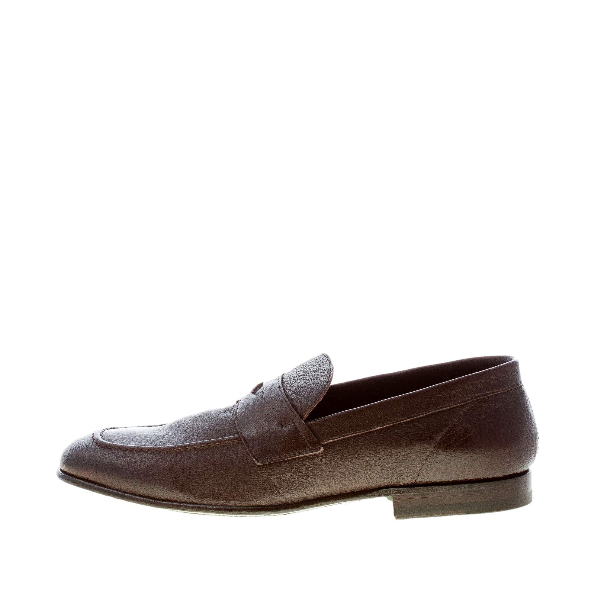 Dark brown luxury soft deer leather loafer with the front classic “penny” bar. Completely handmade in Italy. “Apron toe” style stitching at toe. Leather sole