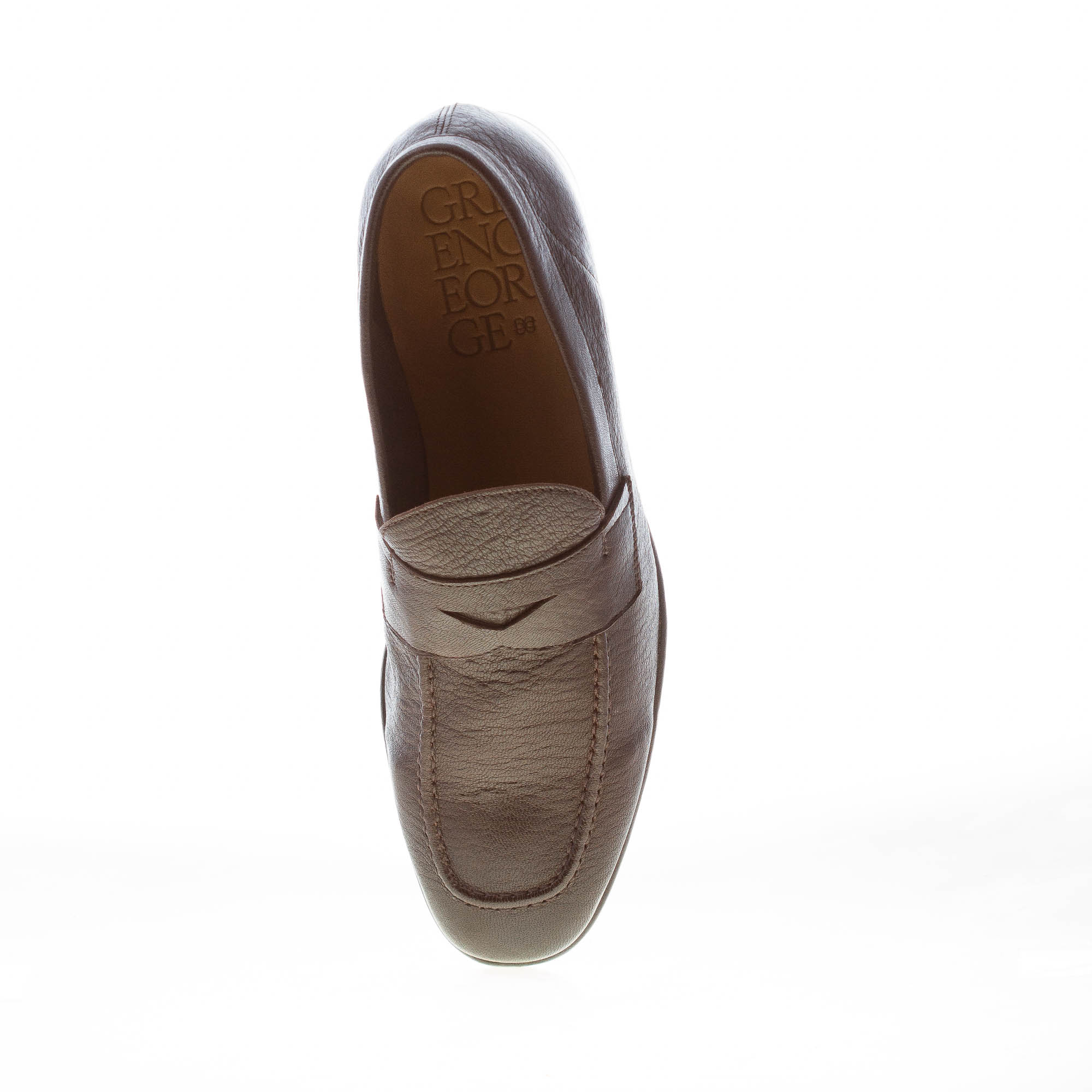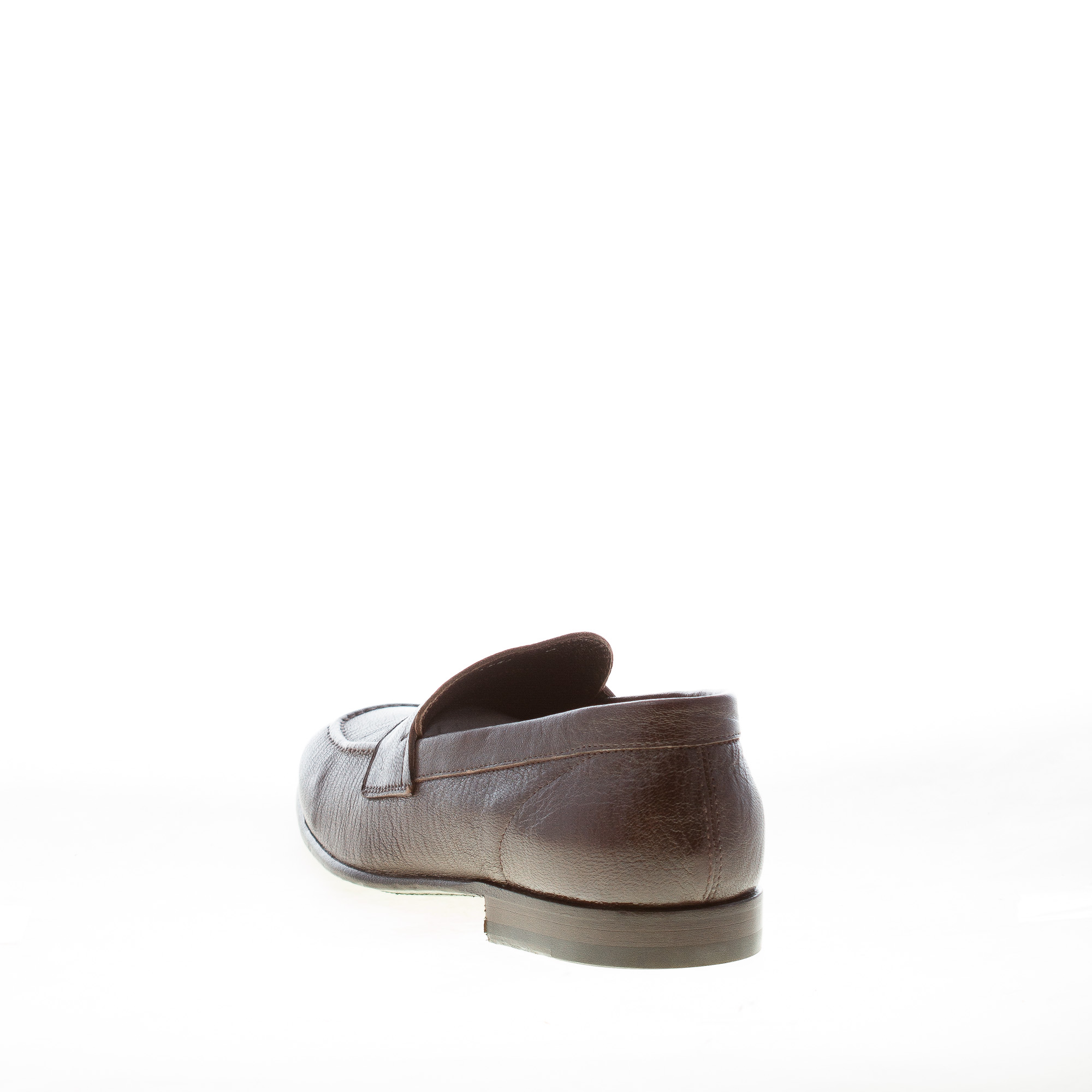 Mocassino artigianale fatto a mano in pelle di cervo martellata testa di moro con la classica mascherina “penny”. Cucitura a vaschetta sulla punta. Suola in cuoio