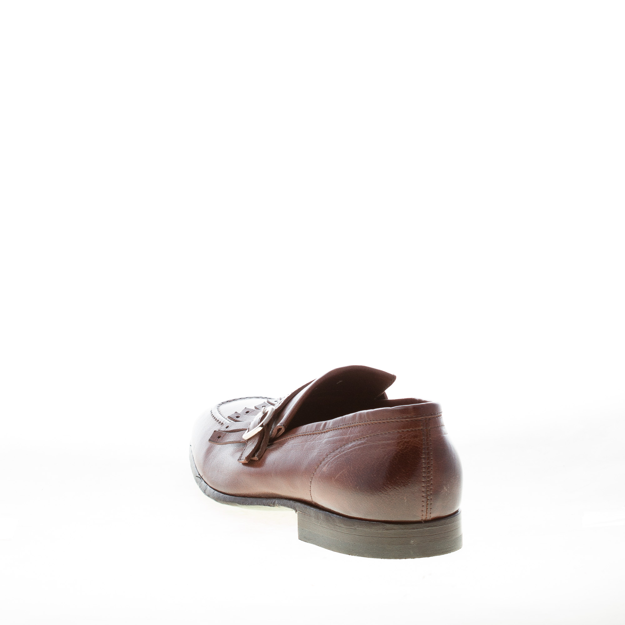 Mocassino artigianale fatto a mano in Italia realizzato in morbida pelle anticata colore cuoio con maxi dettaglio sfrangiato e passante con fibbia. Cucitura a vaschetta squadrata sulla punta. Cuciture in rilievo. Suola in cuoio