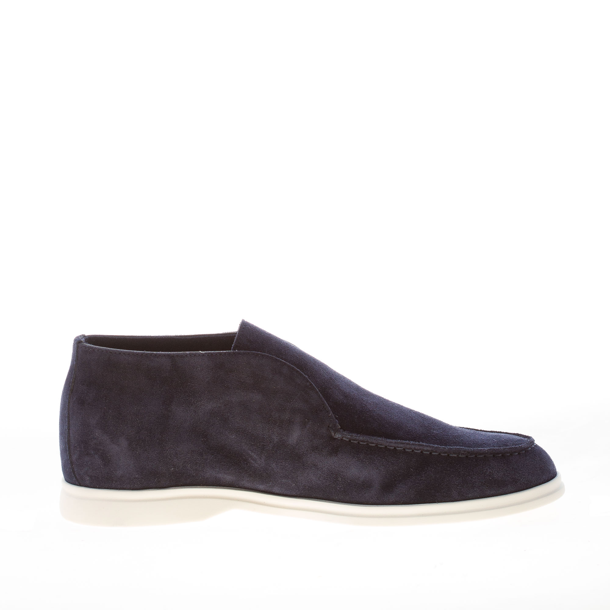 Scarpa polacchina senza lacci, made in Italy, realizzata in camoscio blu notte con cucitura a vaschetta sulla punta. Inserti elasticizzati sulla linguetta per agevolare la calzata slip-on. Suola in gomma chiara a contrasto