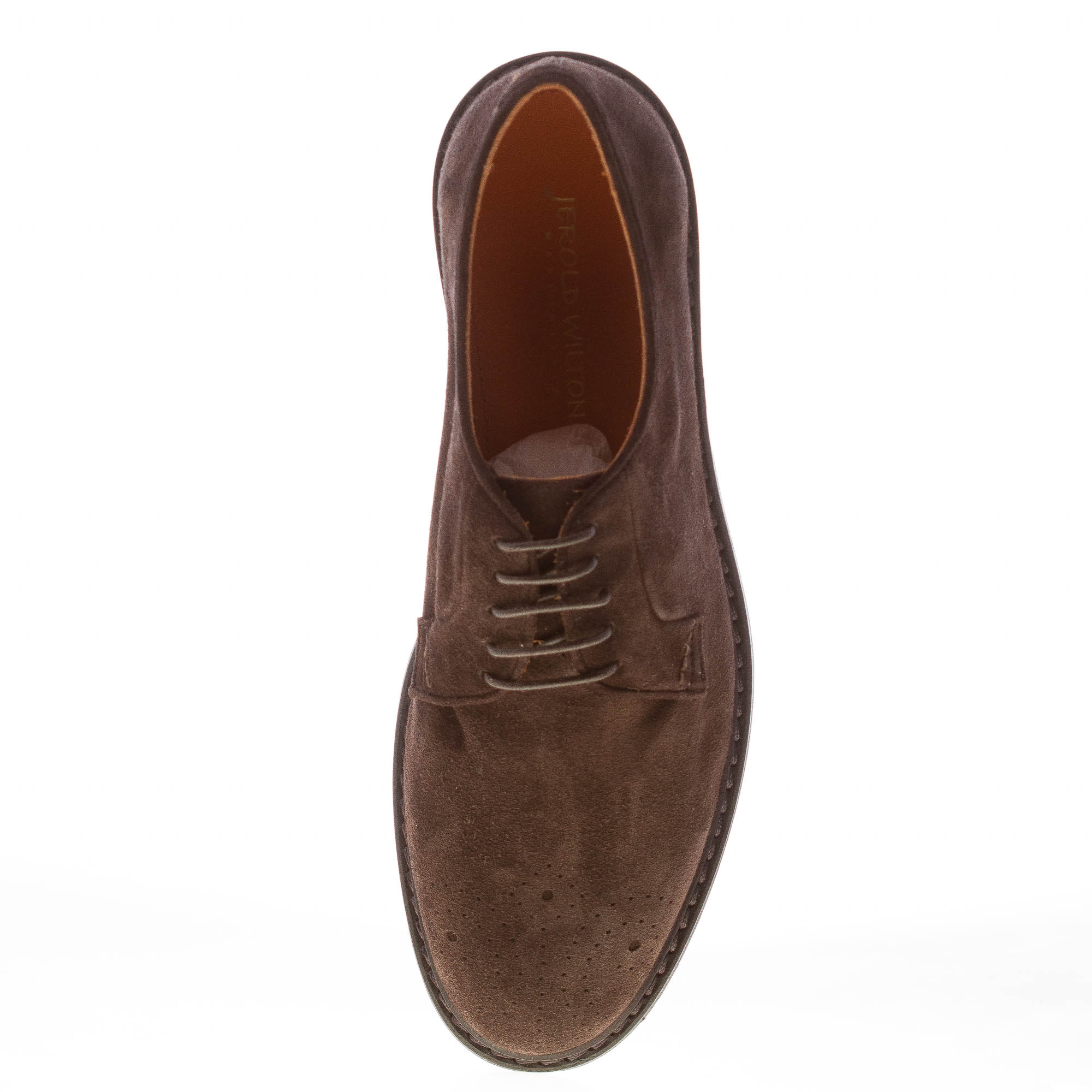 Scarpa classica derby Jerold Wilton, made in Italy, realizzata in camoscio marrone moka con una leggera decorazione “medallion” sulla punta tonda. Cuciture in rilievo sul guardolo. Costruzione blake. Suola in cuoio