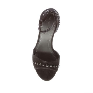 Black suede d’Orsay style Elissa sandal with a single open toe band and a throughout tonal polished studs decoration. Ankle strap with adjustable buckle. Heel 10 cm. Faux-leather sole