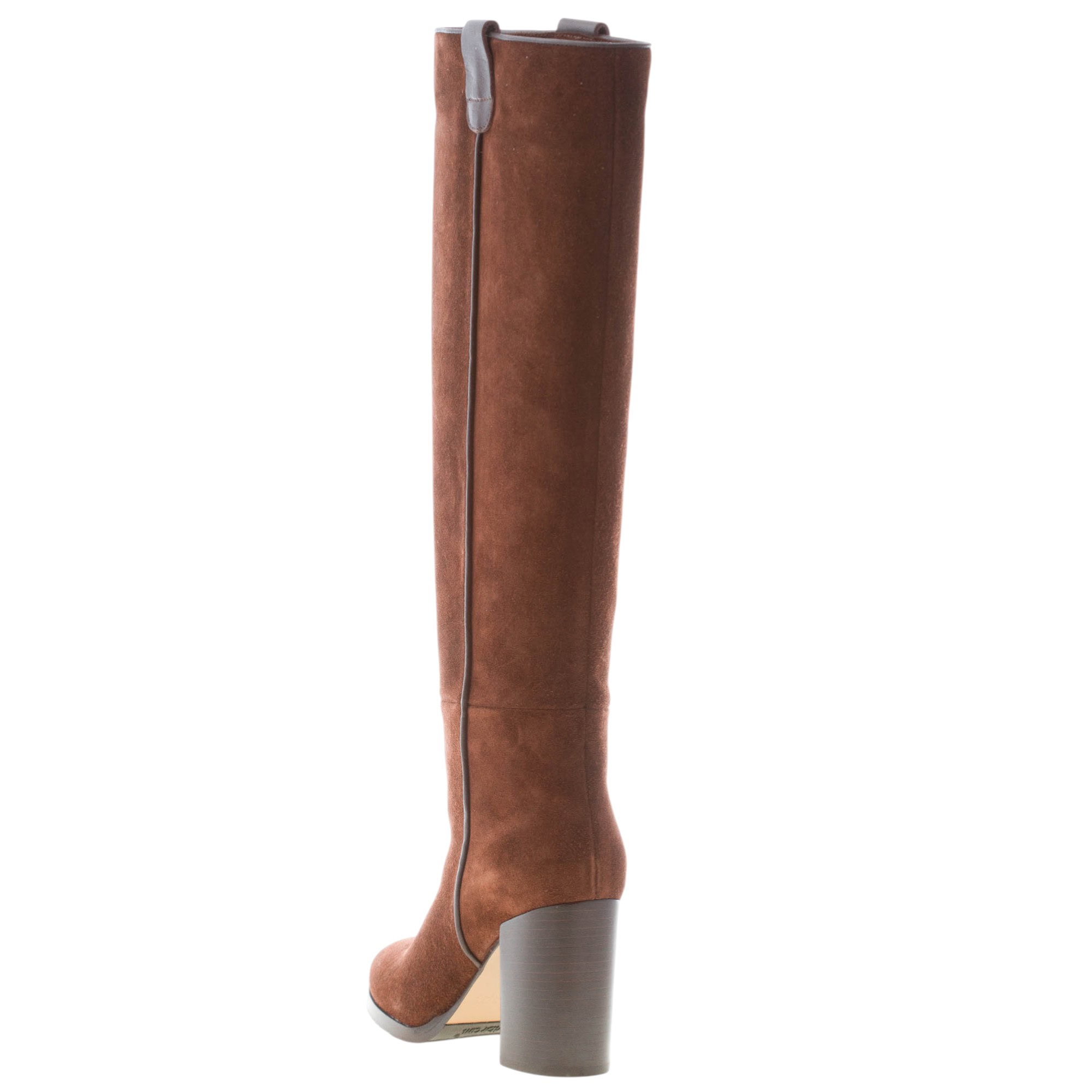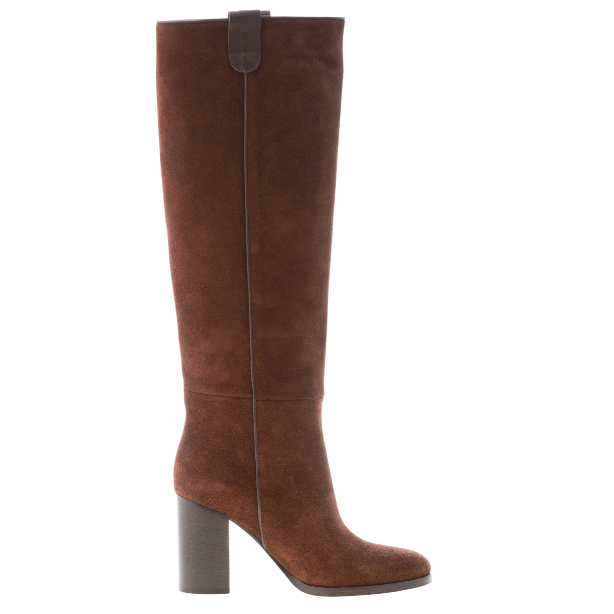 Brown chocolate suede boot with a plain round toe and a slip-on dress. Made in Italy. Leather sole with antislippering rubber insert. Heel 8 cm