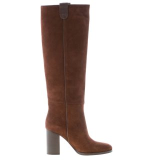 Stivale in camoscio marrone cioccolata con punta liscia tonda e calzata slip-on. Made in Italy. Suola in cuoio con inserto antiscivolo in gomma. Tacco 8 cm