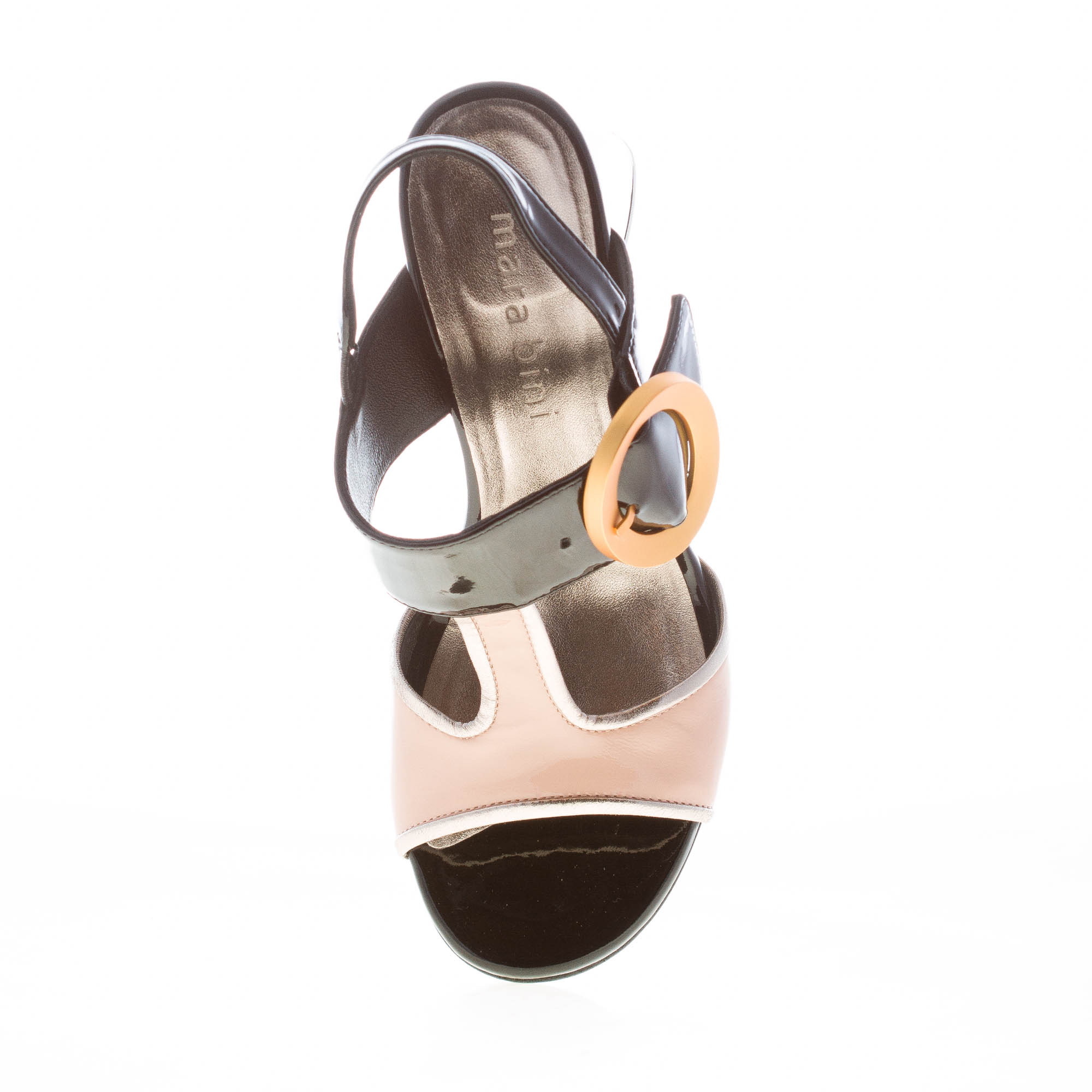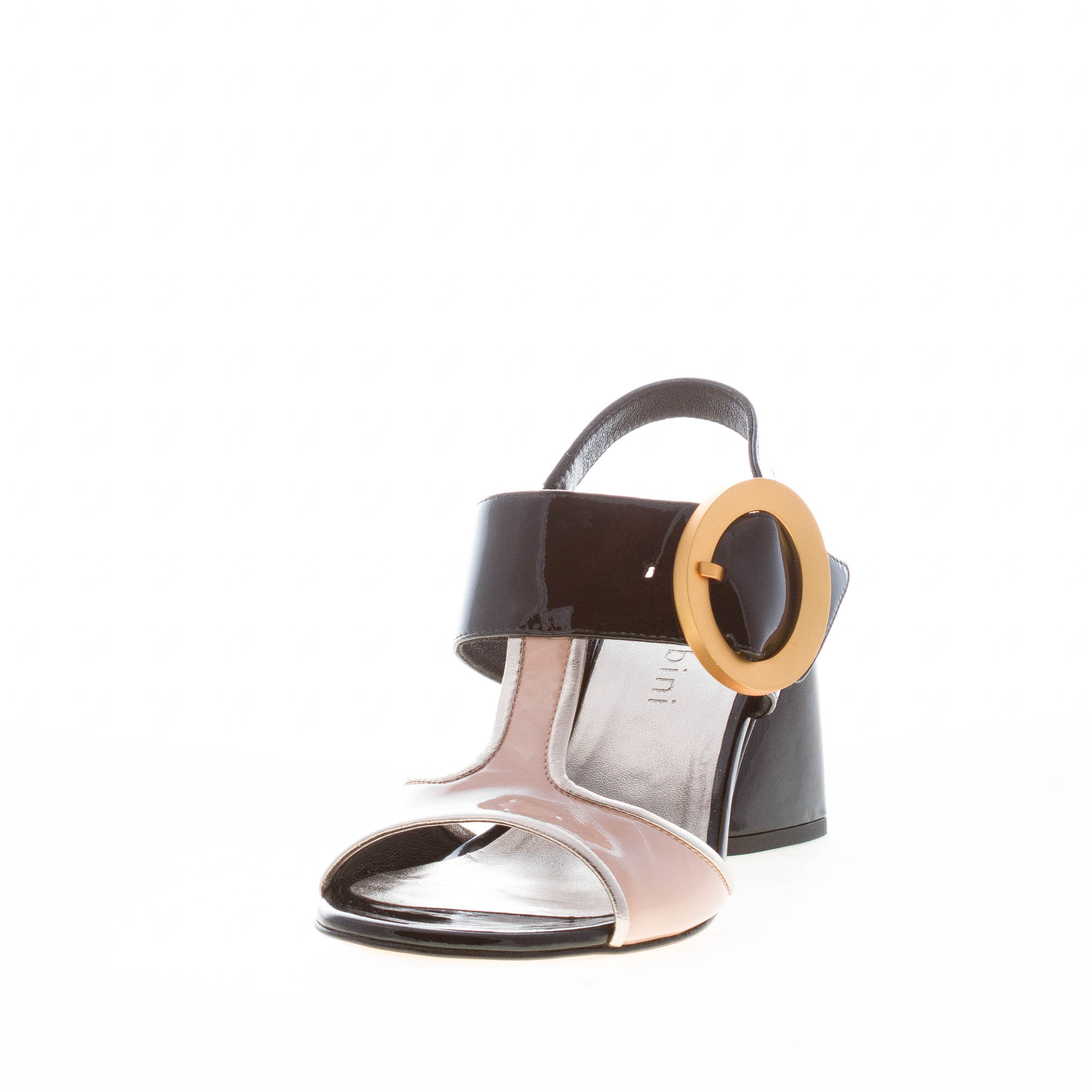 Sandalo modello Stella realizzato in pelle verniciata rosa nude e nero con design a T-Strap e larga fascia sul piede. Dettaglio col grossa fibbia decorativa in metallo dorato. Chiusura slingback con cinturino elasticizzato. Suola in cuoio con inserto antiscivolo. Tacco 7,5 cm