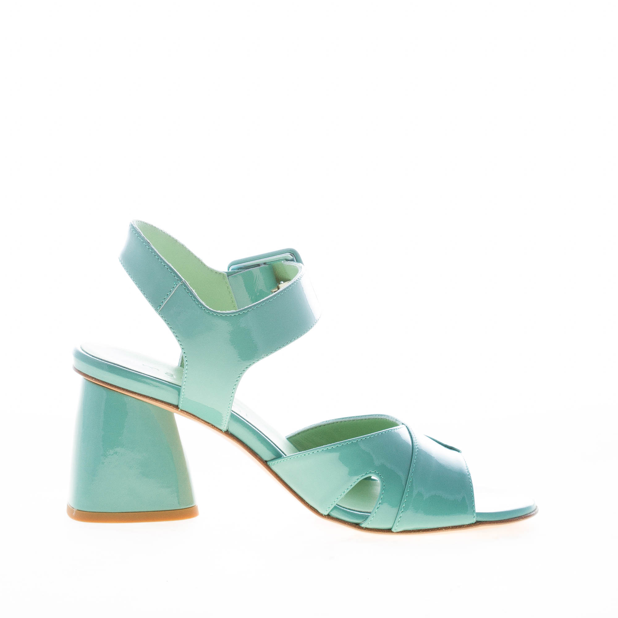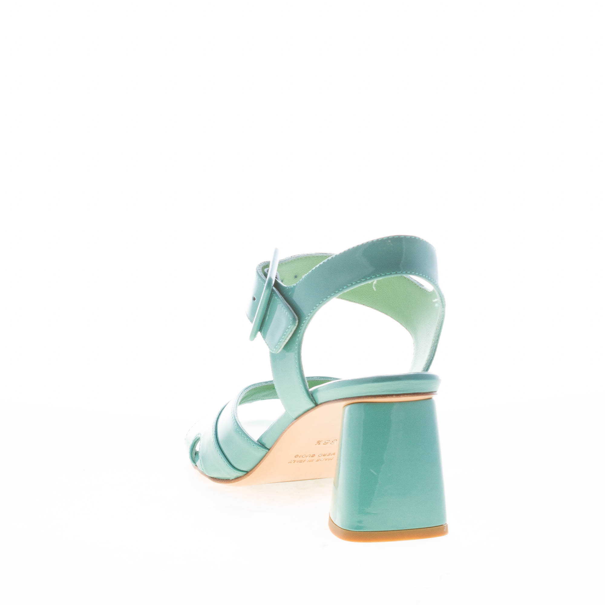 Emerald tone patent leather Stella sandal, made in Italy with a front open toe band and an ankle strap with adjustable tonal buckle. Leather sole with a rubber antislippering insert. Covered heel 7,5 cm