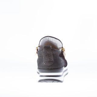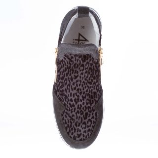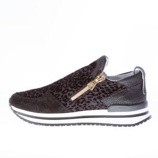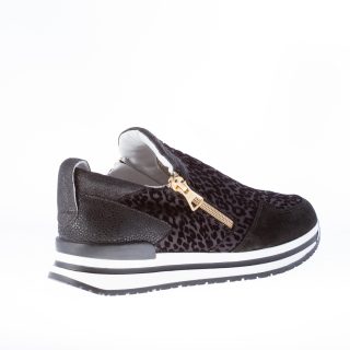 Black animalier print fabric slip on sneaker with golden zip on sides. Black suede and glitter trims