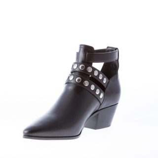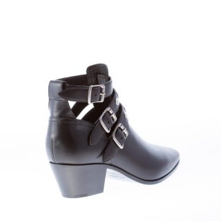 Stivaletto a punta in pelle nero con tre cinturini arricchiti da borchie e fibbie in metallo argento. Chiusura con fibbie regolabili. Suola in cuoio. Tacco 4,5 cm
