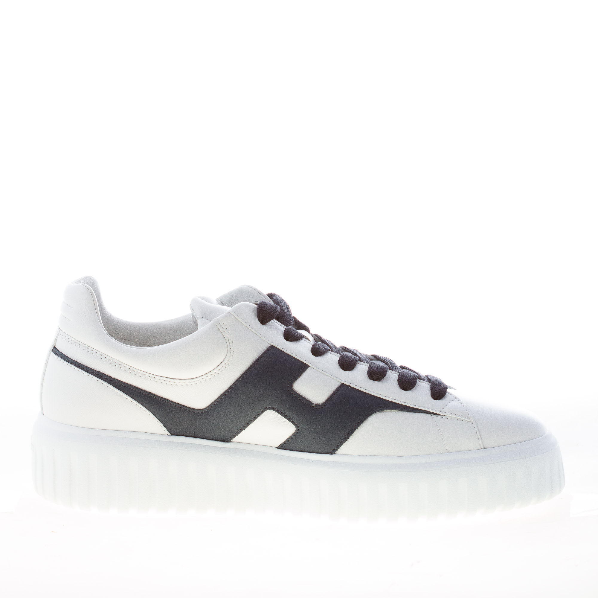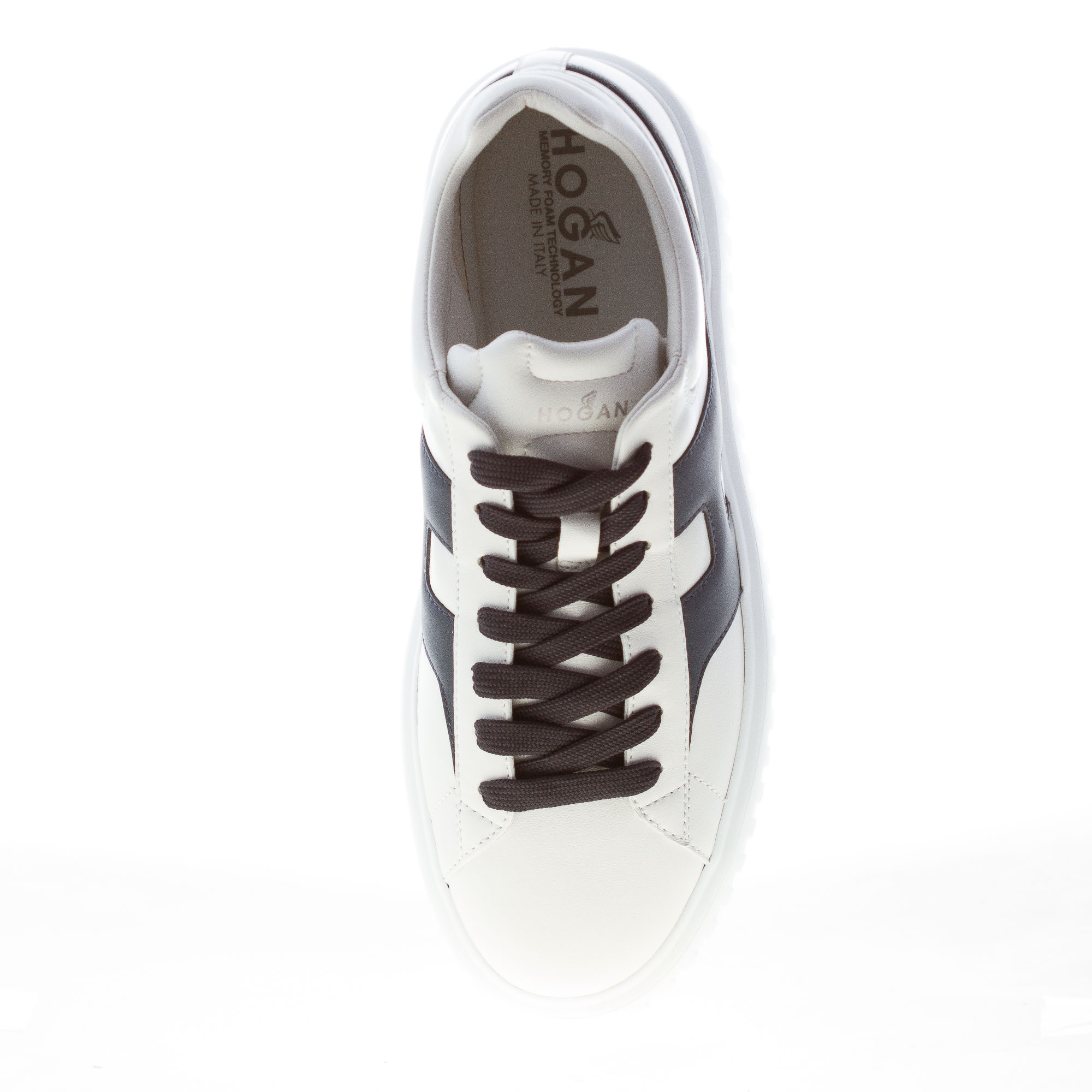 Sneaker Hogan H-STRIPES realizzata in morbida nappa bianca con talloncino imbottito. Monogramma brand Hogan imbottito ai lati in pelle blu con forma allungata e impunture. Fussbett interno in memory foam di 0,8 cm. Suola in Eva extralight con righe verticali con altezza totale di circa 4,8 cm