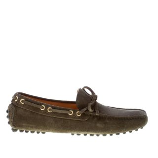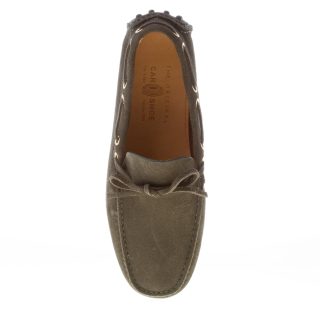 Mocassino driving in pelle scamosciata verde mimetico con laccetto. Cuciture in rilievo e costruzione tubolare. Anellini passavela in metallo. Suola con gommini