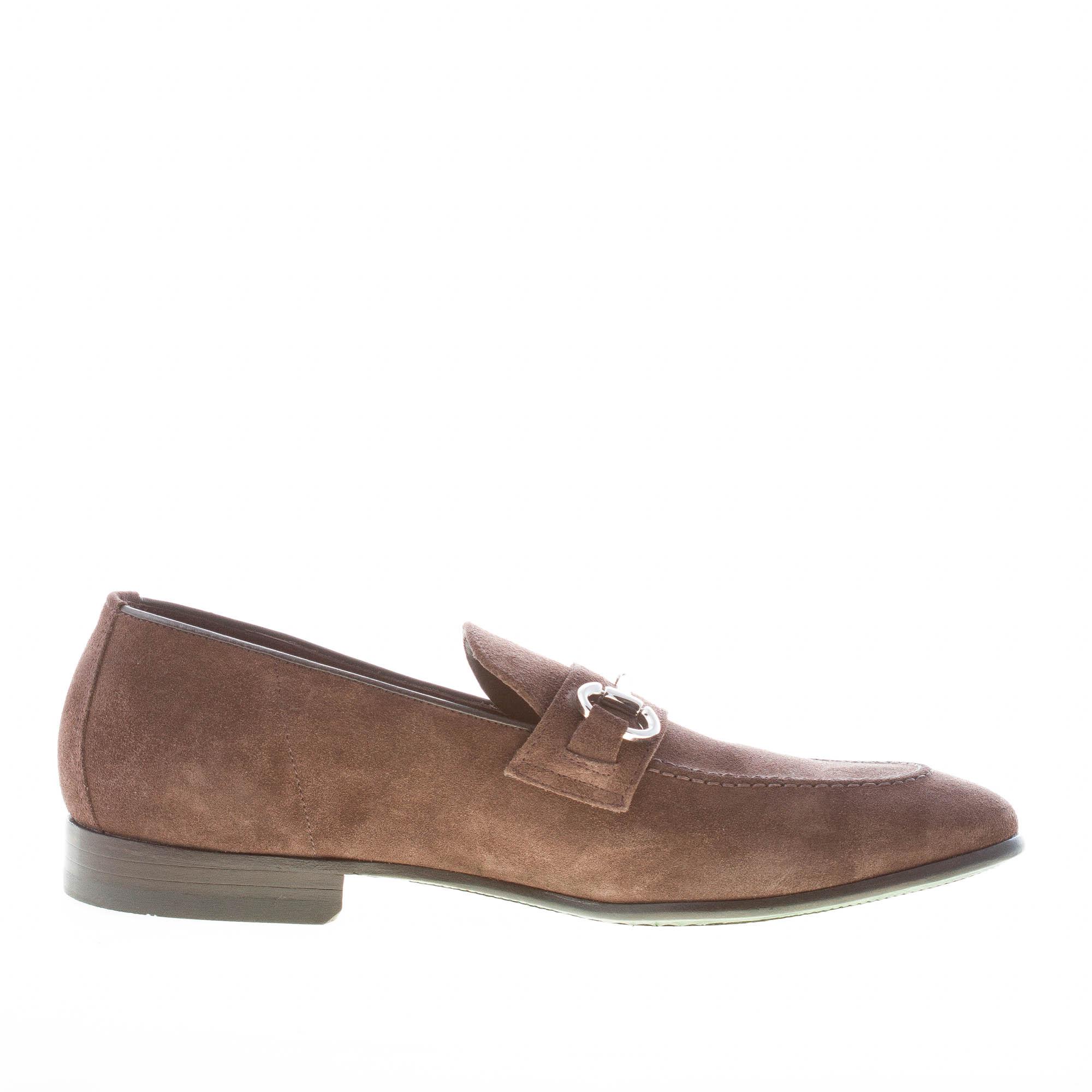 Dark brown suede loafer with a front classic bar and silver metal horsebit. Handmade in Italy. “Apron toe” style stitching at the almond toe. Leather sole