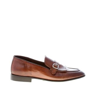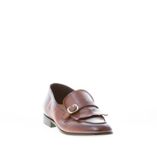 Mocassino artigianale in vitello anticato marrone caratterizzato da una patta frontale cucita sulla linguetta ed un cinturino decorativo con fibbia in metallo. Cucitura a vaschetta sulla punta. Fatto a mano. Suola in cuoio