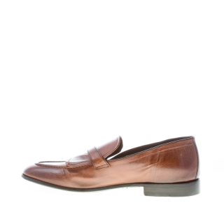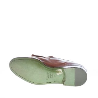 Brown antiqued leather handcrafted loafer featuring a front stitched flap decorated with a buckled strap. “Apron toe” style stitching at toe. Leather sole