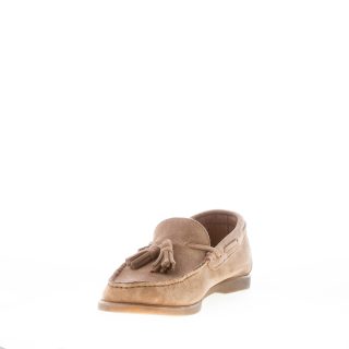 Mocassino artigianale in camoscio beige con nappine e cucitura a vaschetta sulla punta. Dettaglio al tallone con pelle scamosciata cucita in rilievo. Suola flessibile in gomma con “effetto usato” vintage