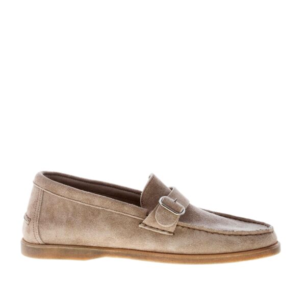 Mocassino artigianale in camoscio tortora con fascetta frontale e fibbia in metallo. Cucitura a vaschetta sulla punta. Suola in gomma vintage ultra-flessibile