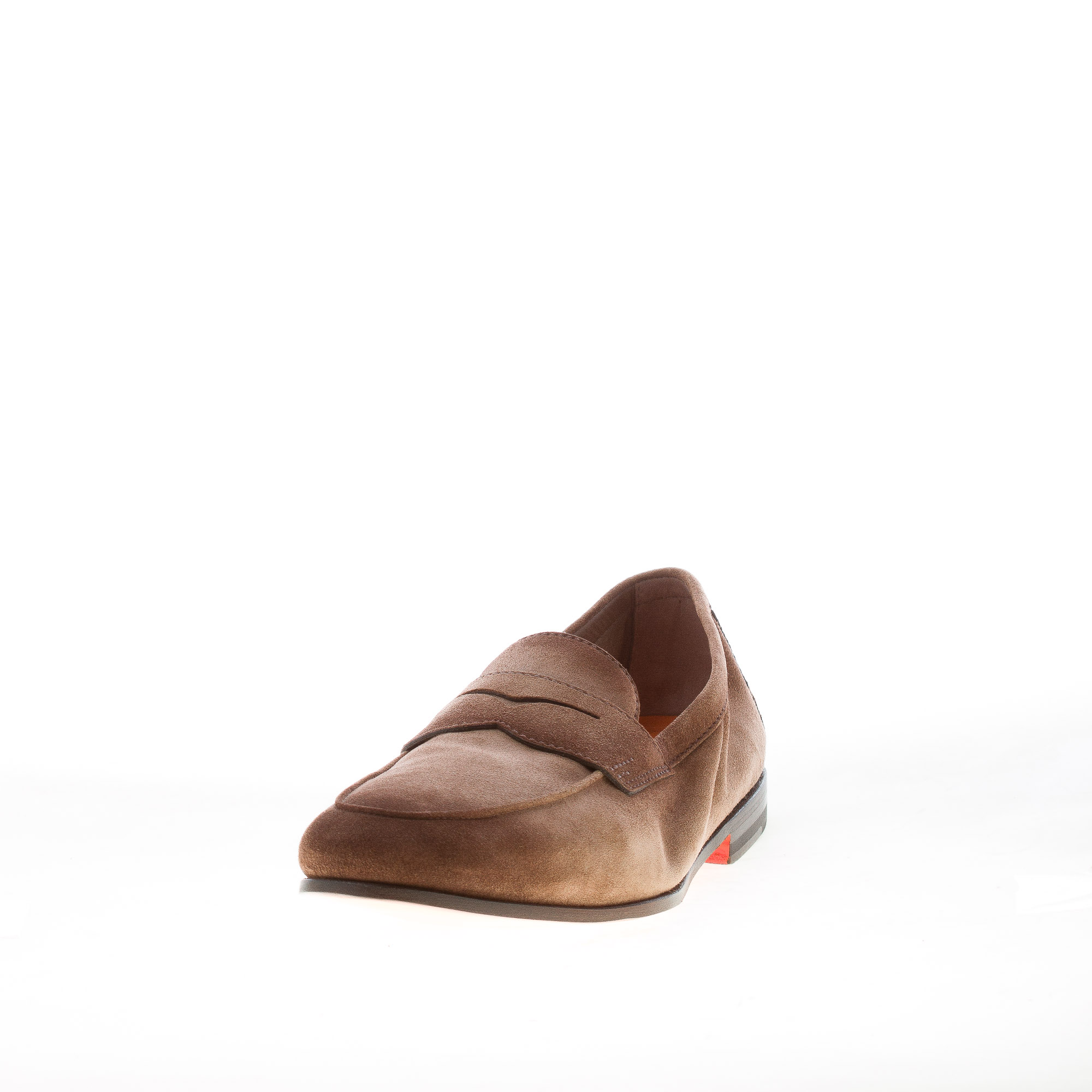 Brown delavè fine suede penny loafer with the iconic Santoni “velatura” color-grading technique and an apron toe exposed stitching. Luxury Goodyear construction. Iconic orange footbed and outsole. Flexible leather sole