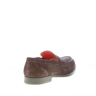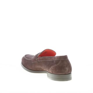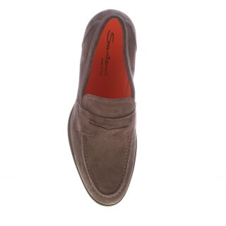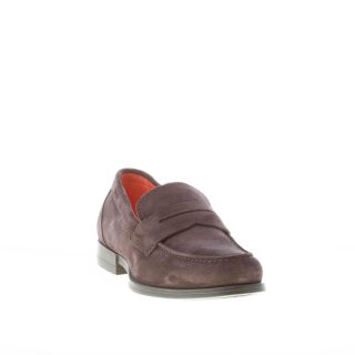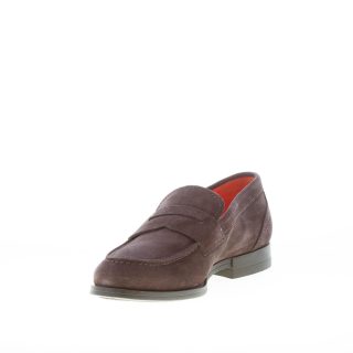 Dark brown suede Santoni loafer with the classic penny bar and the apron toe stitching. Exposed stitchings. Rubber sole