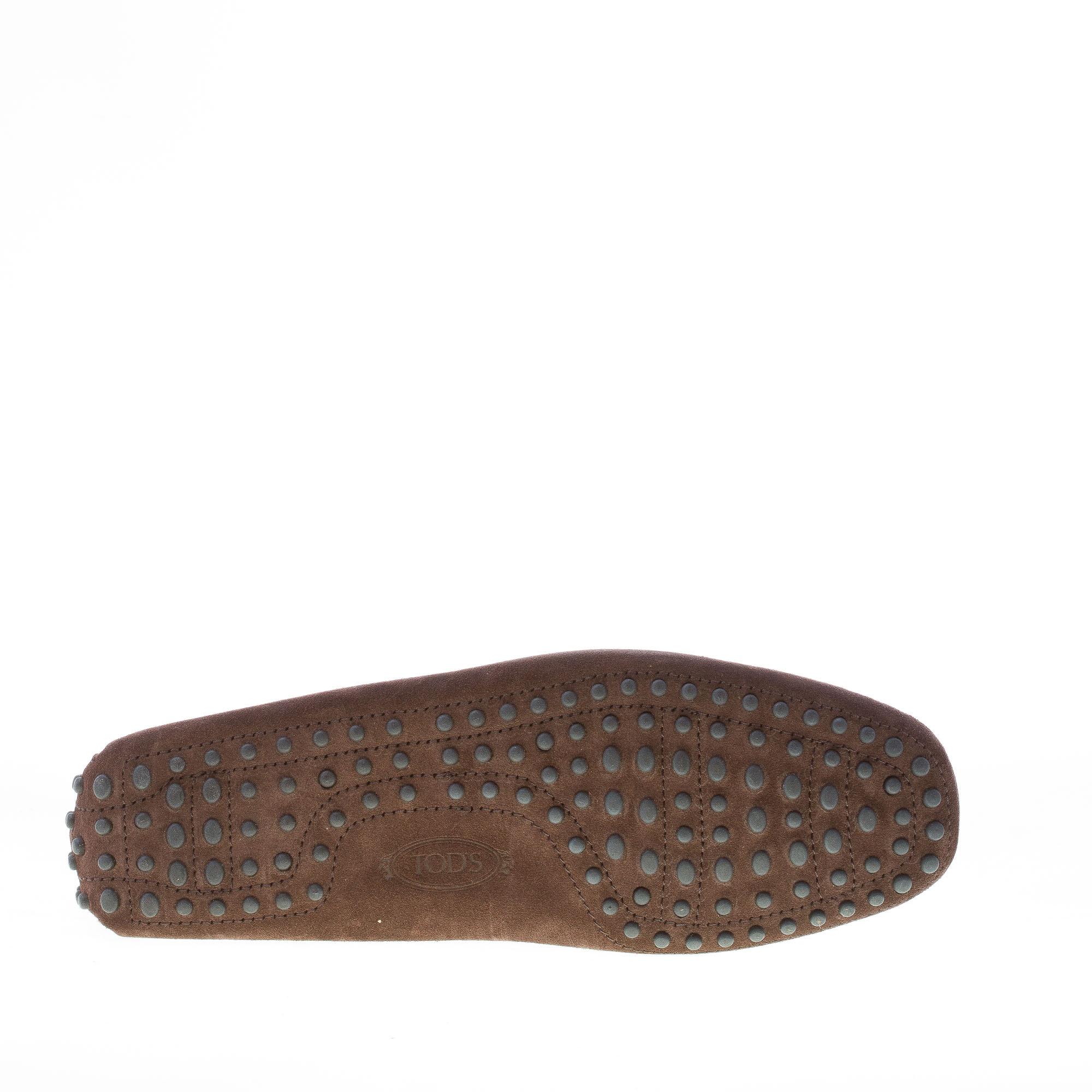 Mocassino driver in camoscio testa di moro con laccetto passante. Cuciture in rilievo. Monogramma Tod’s impresso. Iconica suola con gommini