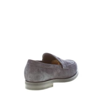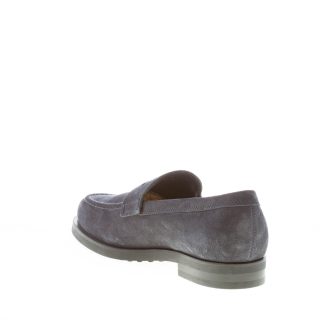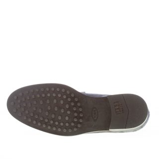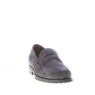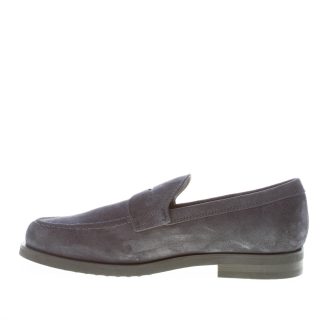 Dark blue suede loafer with the classic penny bar and apron toe. Exposed stitchings. Hot stamped Tod’s monogram. Rubber sole with embossed pebbles