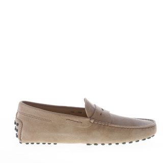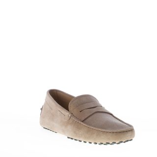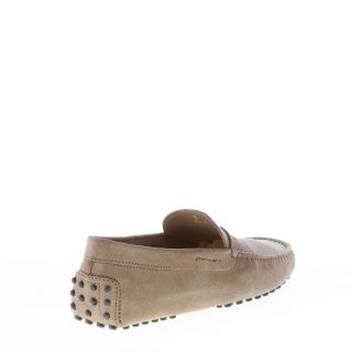 Mocassino driver in camoscio beige torba con fascetta penny.Cuciture in rilievo. Suola con gommini