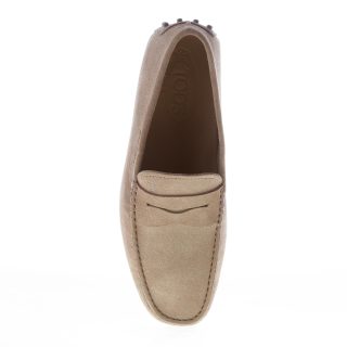 Torba beige suede “gommini” penny loafer. Exposed hand stitching. Pebble rubber sole