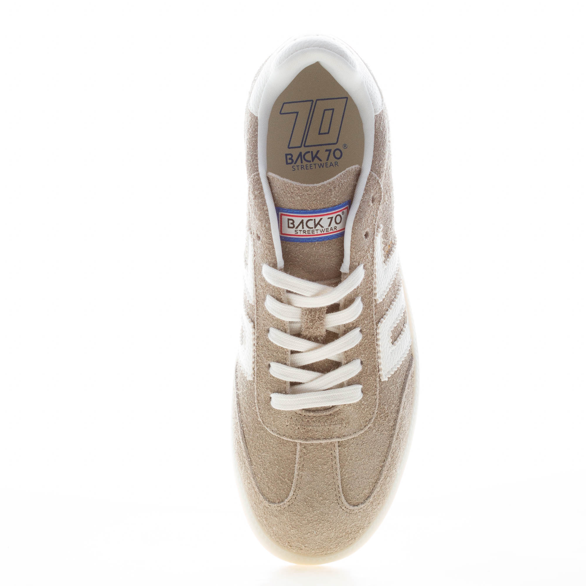 Boston sneaker made in beige hairy suede with a white croco printed leather logo 70 at side and padded heel tab. Tonal laces and removable 1,5 cm footbed. Rubber