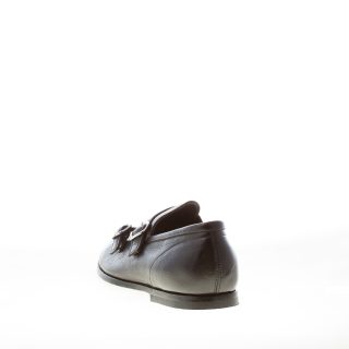 Scarpa artigianale, fatta a mano in Italia, realizzata in morbida pelle di cervo martellata nera con chiusura a doppia fibbia e cucitura a vaschetta sulla punta. Suola in cuoio