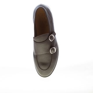 Black luxury soft pebbled deer leather handmade in Italy double monk strap shoes with a front apron toe. Silver metal buckles. Leather sole