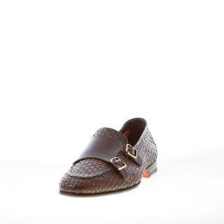 Dark brown fine woven leather double monk strap loafer with an almond toe and an apron toe exposed stitching. Handmade gradated finish. Two golden tone metallic buckles. Luxury artisanal workmanship. Iconic orange footbed and outsole. Leather sole