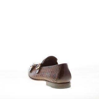 Mocassino con doppia fibbia realizzato in pregiata pelle intrecciata testa di moro con punta leggermente affusolata e cucitura a vaschetta in rilievo. Doppia fibbia dorata in metallo smaltato. Sfumature di colore sulla pelle applicate a mano. Lavorazione artigianale. Iconico sottopiede e suola arancione. Suola in cuoio.