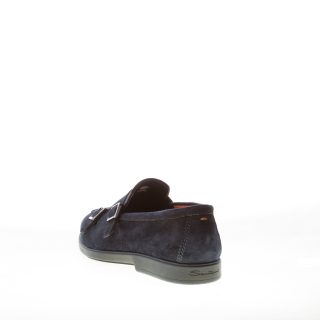 Mocassino con doppia fibbia realizzato in pregiato camoscio blu notte con cucitura a vaschetta in rilievo sulla punta. Patta frontale con doppia fibbia in metallo brunito. Lavorazione artigianale. Iconico sottopiede arancione. Suola in gomma flessibile.