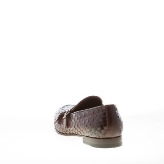 Scarpa con doppia fibbia realizzata in pelle intrecciata colore testa di moro con vaschetta impunturata cucita sulla punta. Patta con doppia fibbia in metallo argento. Fatte in Italia. Lavorazione blake. Suola in cuoio con inserto antiscivolo in gomma