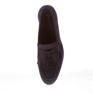 Mocassino in morbido camoscio blu navy con maxi dettaglio sfrangiato e passante con nappine. Cucitura a vaschetta sulla punta. Fatto in Italia. Lavorazione blake. Suola in cuoio flessibile con inserto antiscivolo in gomma