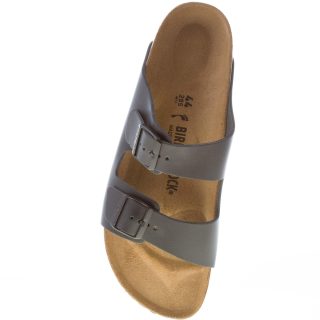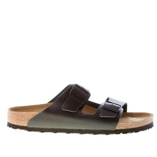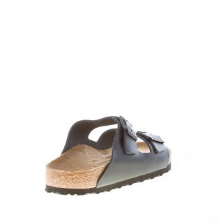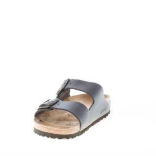 Black color natural leather material Arizona BS slide sandal with two straps and adjustable metal buckles. Anatomically shaped cork-latex footbed. Narrow fit. Eva sole