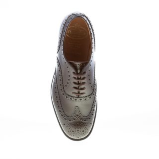 BURWOOD scarpa Oxford realizzata in pelle di vitello con finitura spazzolata lucida colore ebano light. Classiche impunture full brogue. Interno foderato in vitello. Realizzata con metodo Goodyear. Fit G. Custom Grade. Suola in cuoio con inserto antiscivolo in gomma