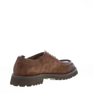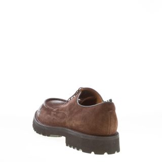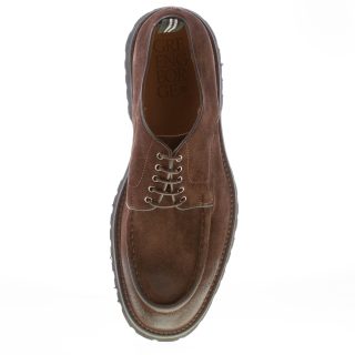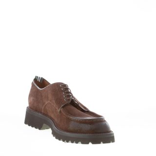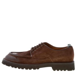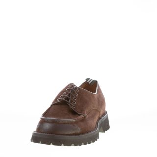 Dark brown fine suede handcrafted in Italy laced shoes with a front norwegian style apron toe stitched detail. Exposed stitching on welt. Extralight rubber sole with lug detail