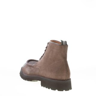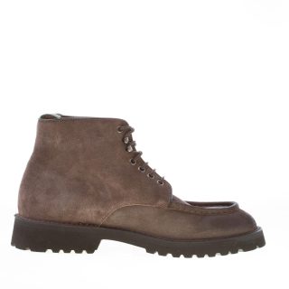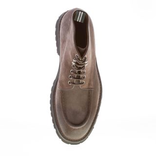 Tortora (color between grey and brown) suede handcrafted in Italy laced ankle shoes with a front norwegian style apron toe stitched detail. Exposed stitching on welt. Extralight rubber sole with lug detail