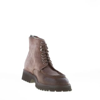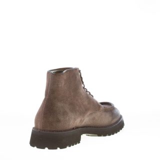 Scarponcino stringato artigianale realizzato in crosta tortora (colore con sfumature di grigio e marrone) con vaschetta cucita in rilievo in stile norvegese. Cuciture in rilievo sul guardolo esterno. Fatte in Italia. Suola in gomma extralight con dettaglio carrarmato
